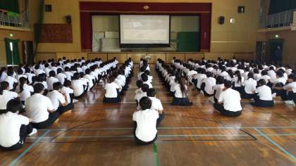 本日、卒業生の映像を見ながら、体育大会で披露する学年演技について、平賀先生より3年生に説明がありました。体育大会まで1か月という短い期間で一生懸命練習し、素晴らしい学年演技を披露してくれることと思います。