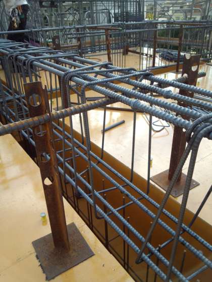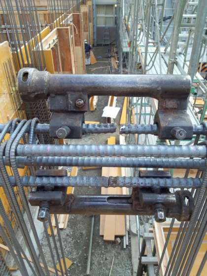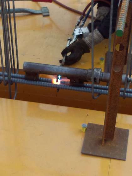 写真は北棟2階梁の物ですが、鉄筋をガスであぶり、鉄筋同士を押し付ける様に圧力を掛けて、溶かしてひっつけます。