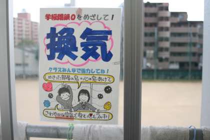 保健委員の取組で、移動教室を除くすべての休み時間に空気の換気が行われています。ステッカーの張られた窓ひとつ開けるだけで、二酸化炭素濃度が下がるのみならず、乾燥によって増加した風邪の菌やウィルスを外へ追い出します。