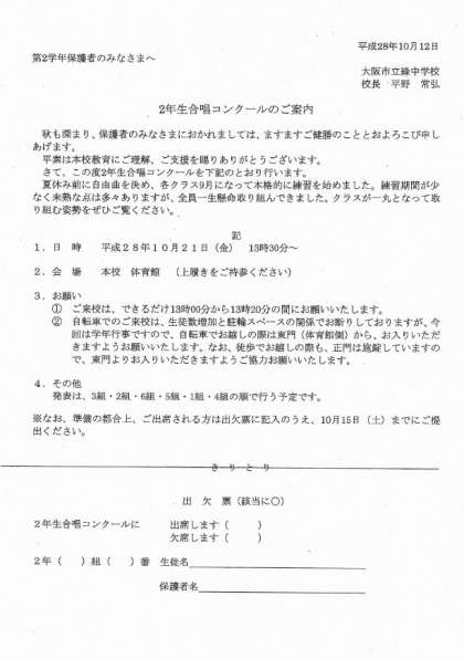 本日、「合唱コンクール」の案内プリントを2年生の生徒に配布いたしました。予定日時は10月21日(金)13:30〜となっております。出欠票を記入の上、提出していただきますよう宜しくお願いします。