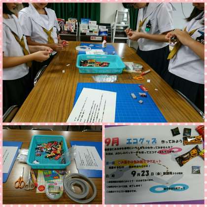 さて、元気アップでは放課後の図書開放の時間を利用して「手作りエコグッズ教室」を開催しました。第一回目はチョコの包み紙でマグネットを作ってみました。次回は10月末頃を予定しています。