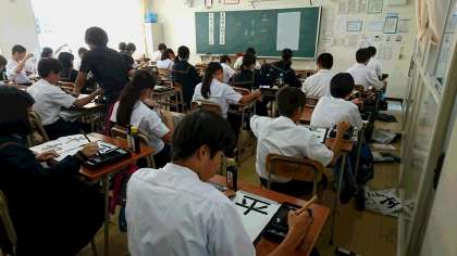 今日の2時間目は1年2組と4組で習字をやっていました。一生懸命「平和」という題に取り組んでいました。「平」が簡単だけど意外とバランス取りにくい字なんです。私も自分の名前に入っているので昔から習字のときに困った思い出があります。なお、作品は文化祭で展示されるようです。