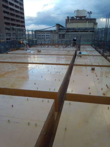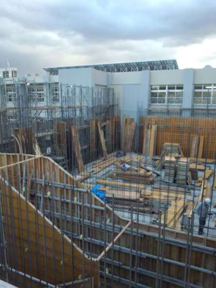 本日は北棟3階天井型枠の組立と、1階天井型枠の解体、南棟は3階の柱型枠組立を行いました。明日より、北棟の梁配筋を行います。