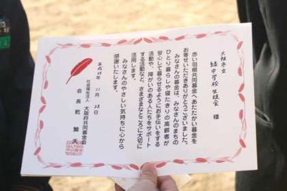 2学期に実施しました赤い羽共同募金の感謝状が、大阪府共同募金会より届きました。生徒会が中心となり全校生徒へ呼びかけた募金は、ひとり暮らしや寝たきりの高齢者が安心して暮らせるようにお手伝いする活動や、障がいのある人たちをサポートする活動など、さまざまなところで大切に活用されるとのことです。