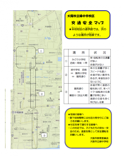 緑中学校の校区内の交通安全MAPを作成しました。ホームページ右下の「連絡」にも掲載していますので、ご確認ください。