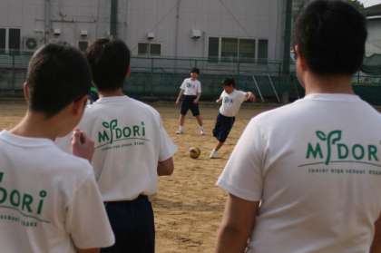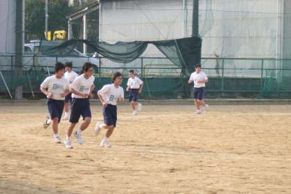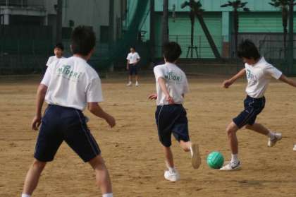 2年の体育は、グランドにおいてランニングで体を温めてから授業を開始しています。息を切らしながら、もくもくと走り続ける生徒の姿が見られました。その後、ラグビーのポールをゴールにし、ボールをふたつ使った全体サッカーで汗を流しています。半袖半ズボンでも寒さを見せません!