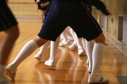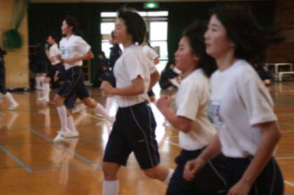 体育2年女子は、体育館においてシャトルランで体を温めてから授業に臨みます。