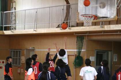 その後、ボールを3つ使った全体バスケットボールを行いました。ゲームの待ち時間がないぶん、全員が動きながらゲームに参加できるよう、ルールが工夫されています。