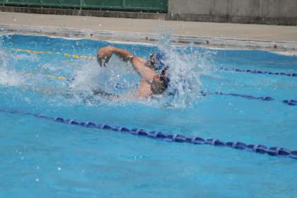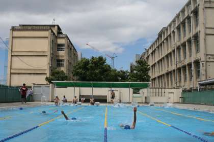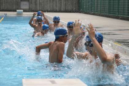 台風もどこへやら、強い日差しが照りつける中、生徒たちは水しぶきをあげて泳いでいます。
