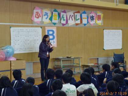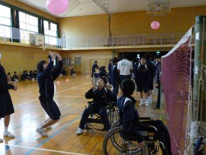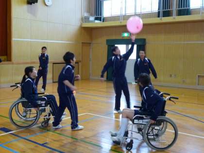 人権教育の一環として、障がい者スポーツに触れる授業が金曜日の午後、実施されました。「共に学び、共に生きる」の意味を考え実践することを目的に行われた風船バレーボールは、障がいのある人とない人とが、同じコートの中で“対等な立場の選手”として参加できるスポーツです。各チーム、車いすに乗る人、乗らない人を決め、直径40センチに膨らませた風船に鈴2個を入れたものを使用します。