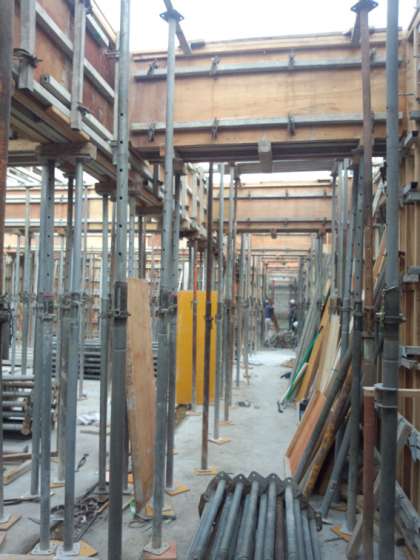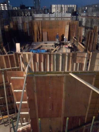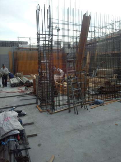 北棟屋上梁鉄筋の圧接と南棟の型枠組立を行いました。