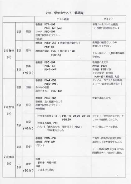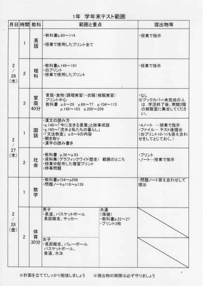 1,2年生は、来週に学年末テストを控えています。テスト範囲表を掲載いたします。日程、テスト範囲、提出物等確認してテストに備えましょう。