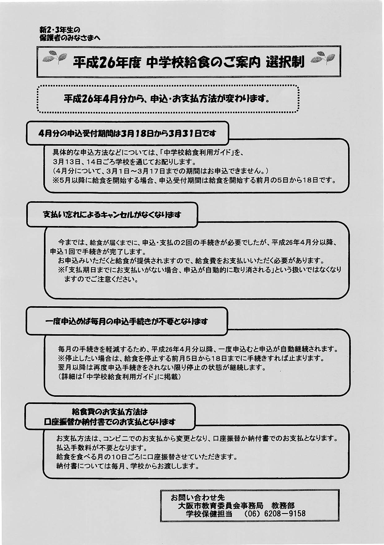 本校では、現1・2年生及び新入生も4月からの給食は選択制です。