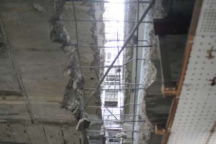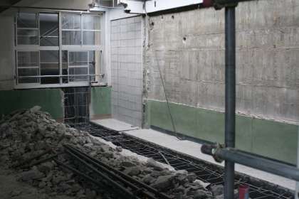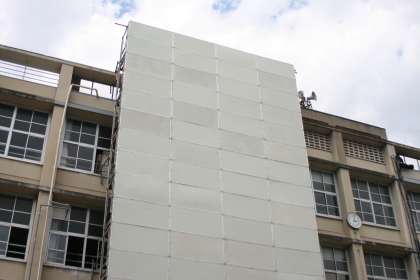 防音壁で覆われた校舎は真っ二つに切断されました。旧校舎のコンクリートで隔てられた壁の向こう側は、着々と解体工事が進んでいます。