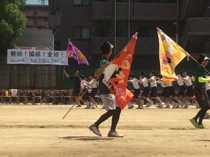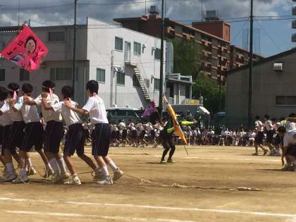 2年生が学年種目「ムカデ競争」でクラス対抗を行いました。担任の先生を中心に円陣を組んで大声でクラスの掛け声、その後に動きを合わせる声をかけて悪戦苦闘しながらゴールを目指していました。