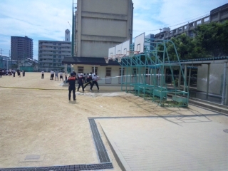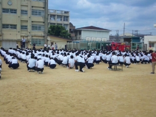 非常ベルが鳴り、放送の指示で1年生から3年生までの全生徒が一斉にグランドに集合するまでに約5分かかりました。