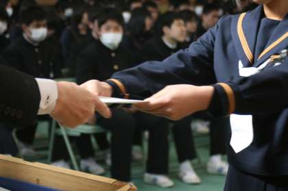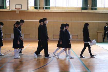 今週金曜日に控えた卒業式を前に、体育館では3年生の卒業式練習が行われています。入場や卒業証書授与を行いました。本番を間近に控え、次第に緊張感は高まってきています。