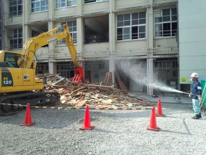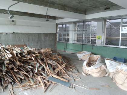 解体する校舎の内装材(木材)を取り外し、建物の外へ出し、