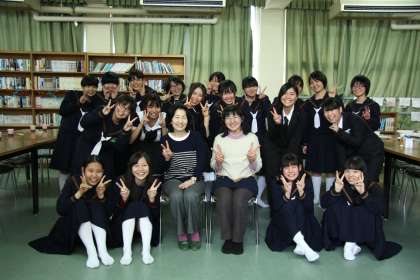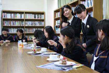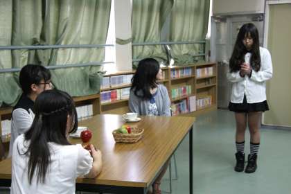 旧校舎の学校図書館が普段と違う様子に飾られています。演劇部が3年生送る会のために、キレいにデコレーションしているのです。メイド服に着替えた2年生は、手作りのケーキや紅茶を準備して卒業生をもてなします。冬休みから、1年生・2年生それぞれが作りあげてきた創作劇を披露しました。