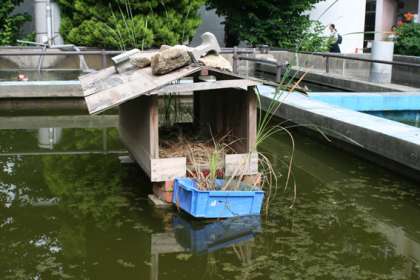 カラスの飛来でどこかへ姿を隠していたカルガモが、日曜に中庭の小屋で産卵していました。池の周囲をロープで囲んだり、カラスよけの模型を設置したりと、先生方の愛情を受けて無事に卵を孵化させることはできるのでしょうか!?