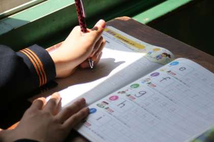 小学校では外国語活動の時間があり、その中で英語に親しむ活動が行われています。中学校に入ると、文法や発音、コミュニケーションをより深く学んでいきます。1年生は、まずアルファベットの書き方を習得し、一学期が終わるころには今とは比べられないほどボキャブラリーを増やしていきます。教職員も複数で対応し、はじめの時期につまずきがないよう見守っています。