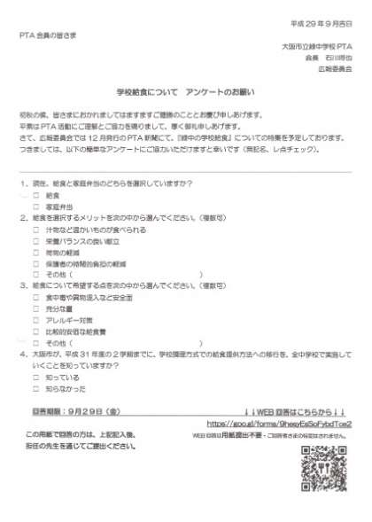 本日、生徒のみなさんにPTA広報から「学校給食について アンケートのお願い」を配布しました。4項目のみのアンケートになっていますのでご協力お願いします。