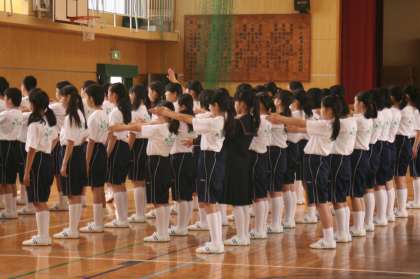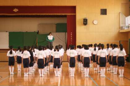 ひと学年200人を越える生徒がスムーズにひとつの行動をとる場合、決まった隊形を覚える必要があります。中学校に入って身につける行動のひとつに集団行動というものがあります。体育の時間では「休め・きをつけ」から始まり、「あいさつ」「集合・整列」と順に練習していきます。本日は「方向転換」「行進」までを習得しました。