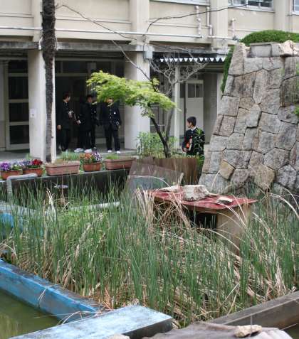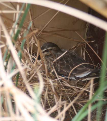 中庭の観察池に建てられた鳥小屋で、じっとうずくまるカルガモの姿が見られました。カモが小屋を離れたすきに、小屋内を覗き込むと、小さな卵が産み落とされていました。待ちに待ったカルガモの産卵です。