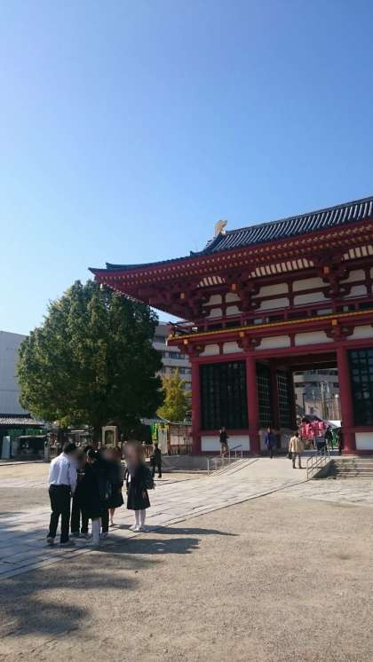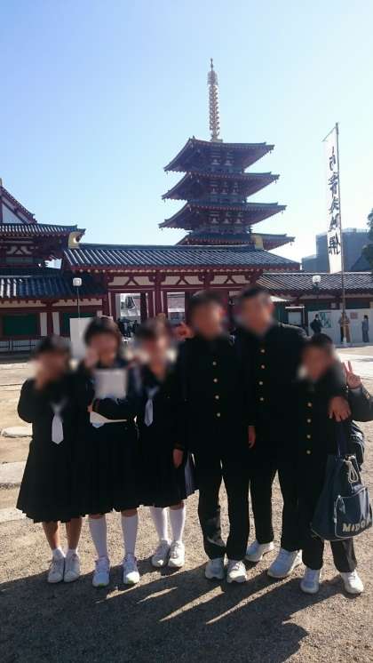 四天王寺の様子です。 班で協力してクイズ形式のワークシートに取り組んでいます。