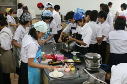 昼前になると家庭科室から何やらいい匂いがしてきます。匂いに誘われ家庭科室を覗いてみると、二年生が調理実習でお昼ご飯のお弁当を作っていました。
