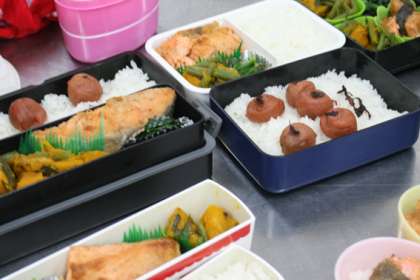 献立は、白ごはん+梅干し、鮭のムニエル、かぼちゃの煮物、ホウレン草のおひたしで、中には白ごはんにほぐした鮭をまぜた「おにぎり弁当」を作っている生徒もいました。各自、自分の作ったお弁当をお昼に食べています。校長先生にも生徒たちからお弁当が届きました。お味を尋ねると「おいしかった!」の太鼓判です。