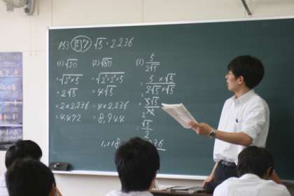 3年生の数学は「分母の有理化」をおさらい中。次第に難易度が増す問題に、学ぶ生徒の姿は真剣そのもの。教える先生も熱が入ります。