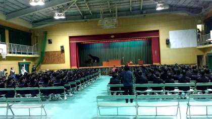 本日の2、3時間目に明日の本番に向けた予行が行われました。午後からは1、2年生の係生徒、クラブ生徒たちが会場設営や清掃を行ってくれました。