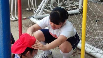 体の小さい園児と目線を合わすようにコミュニケーションをはかろうと努める生徒の姿が印象的です。気持ちを感じ取り、また伝えることができた時にこぼれる笑顔があります。素敵な瞬間をたくさん見つけて持ち帰ってください。