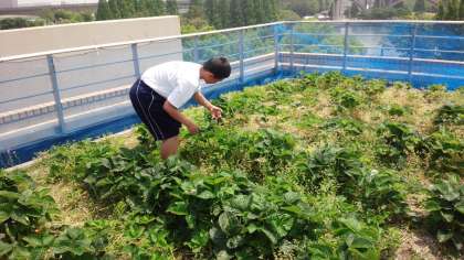 特養(特別養護老人ホーム)と呼ばれる施設には、さまざまな設備があります。寝たまま、座ったままでも入れる広い浴室。看護師さんが常駐する医務室。ひろびろとした交流室。そしてこの施設には屋上にテラスと畑が!今年はいちごの苗が見事に育ち、隣の保育園の子供たちとともに収穫を楽しんだそうです。利用者の方々は土を耕したり、目の前で収穫したりすることをたいへん喜ばれるので、こういった土のある場所を作る施設が増えているんだとか。