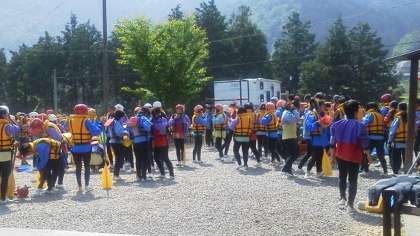 本日のメインイベント、ラフティング体験になりました。ウェットスーツに着替え、ライフジャケット・ヘルメットを装着すれば準備完了。いざ出陣!