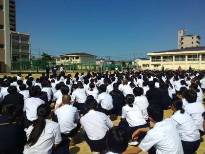 今日の訓練では、サイレンが鳴り開始後4分50秒ほどで、 生徒の集合は完了しました。私語もなく、素早く駆け足で集合する避難態度に関して、校長先生からはお褒めの言葉がありました。