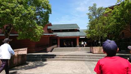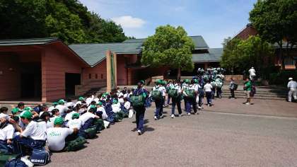 府立少年自然の家に到着しました。荷物を持って移動中です。この後、入所式を行います。