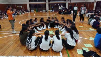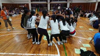 男女別でそれぞれ円になって三角座り。隣の人と足が接した状態から手をつかずに全員が立ち上がれば勝ちです。なかなか立てません。立つ方法を見つけられるかな?3組の男子は3回目の挑戦で立つことができました。写真の班は7回目の挑戦で立つことができました。