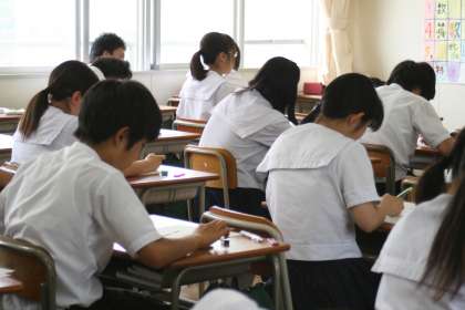 本日は3年生の第一回実力テスト実施日でした。扇風機の風が吹く教室では奮闘する生徒の姿が見られました。