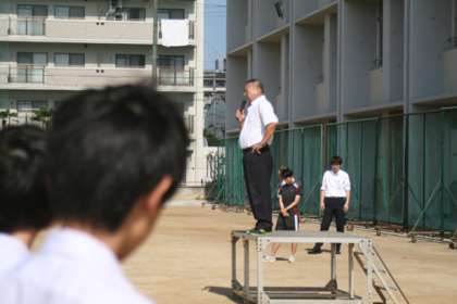 「最近、通勤で感じることがあります。歩道を自転車が猛スピードで走り抜けていきます。狭い場所を我が物顔で走る自転車は、危なくて仕方ありません。」数年前、大阪市内で起きた大きな人身事故の原因が自転車であったことを振り返り、校長先生から「自転車のマナーと安全について」のお話がありました。夏休みは交通事故数が増加します。自転車は本来車両であり、自動車と同じだということを十分に自覚した運転を心がけていきましょう。