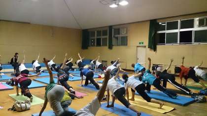 老若男女(?)問わず、楽しく体を動かしました。ヨガのさまざまなポーズを通じて、精神を鍛練していくとか。ふだん使っていない筋肉をプルプルいわせながら、ポーズを決めました。親子参加、大歓迎です。中学生もぜひご参加を。参加ご希望の方は、配布文書一覧にあるヨガ場申込用紙を提出の上、ご参加ください。