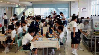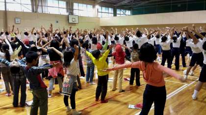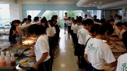 今日は6時に起床し、部屋の清掃のあと体育館で小学生とともにラジオ体操をしました。朝食もメニューが豊富なバイキングで、準備はバッチリです。しかし、雨のためハイキング・カッター活動ともに中止になり、体育館での大縄大会に変更です。