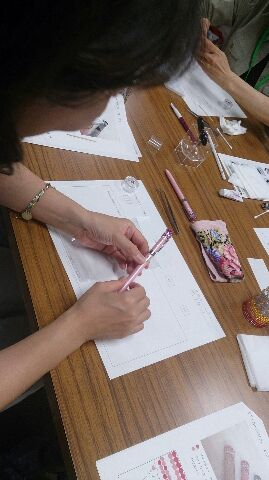 小さなスワロフスキーをボールペン・キーホルダー・髪留めにつけていくのですが、ストーンをつけるのり付けが難しく、皆さん無口になっていきました。
