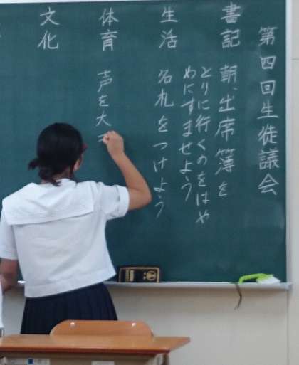 昨日の放課後に生徒議会が行われました。生徒議会は各委員会の委員長と生徒会執行役員で構成されています。委員会で決めた月の目標や活動内容を報告しました。生徒が中心となって学校運営を行っていきます。