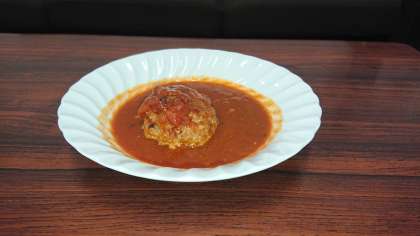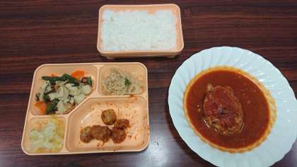 いただいてみると、リコピンたっぷりのトマト味がよく効いた、とても食べやすいハンバーグでした。給食弁当にこの一品が入ればずいぶん豪華に見えますね。