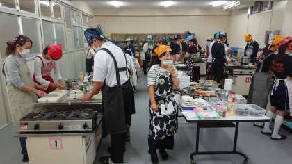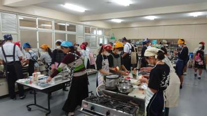 生徒の皆さんと保護者の方々が30人以上集まり楽しく料理に取り組んでいます。