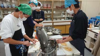 メニューも「かやくご飯」「鶏照りそうめん」「野菜の海水漬け」「まめぶ汁」「りんごのサワークリームケーキ」と盛りだくさんです。女子はもちろん男子もエプロン姿がしっかりはまってかっこいいです。美味しくインスタ映えのする完成を楽しみにしています。