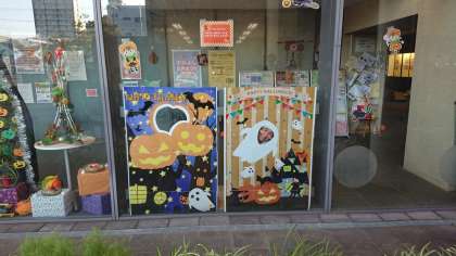ちなみに最後の写真はセンター入口にあったハロウィンの飾りですが、演奏を終えてリラックスした吹奏楽部員がひとり紛れ込んでいます。
