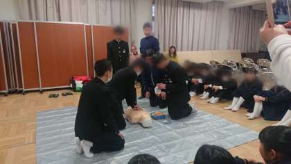 本日の放課後、学校医の北田博一先生を講師に、学校保健委員会を行いました。教員、PTA、1・2年生の保健委員が参加しました。内容は心肺蘇生法で、心臓マッサージ(胸骨圧迫)やAEDの使い方を教えていただきました。委員会の後半では、実際に人形やAEDを使用し、緊急時の対応を体験しました。